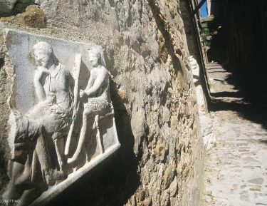 E’ il mercoledì delle Ceneri del 1887 quando la messa viene interrotta da una scossa sismica e dall’urlo di don Lombardi “riparatevi sotto le arcate!”. Da allora sono rimasti solo i ruderi della chiesa ma il paese, raso al suolo dai capricci della natura, non è caduto in abbandono. I colori della Riviera e dei monti vicini hanno ispirato la creatività di artisti italiani e stranieri che tra le pietre dell’antico borgo medievale hanno aperto botteghe d’arte e artigianato. Ora l’abitato e le sue case, anche se non più illuminate a lume di candela, emanano un fascino particolare.