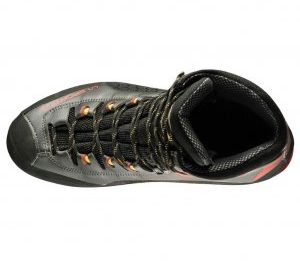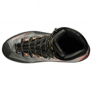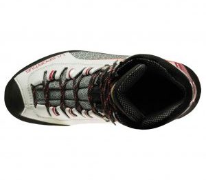 Il tallone è alleggerito con EVA ammortizzante interna e presenta un inserto in TPU che aumenta l’ammortizzazione e la risposta elastica della calzatura. Un’apposita tacca, sempre sul tallone, consente l’utilizzo di ramponi semiautomatici, mentre la sagomatura e la scolpitura della parte anteriore della suola sono pensate per migliorare la stabilità e l’aderenza su terreni tecnici e ne passaggi di arrampicata.