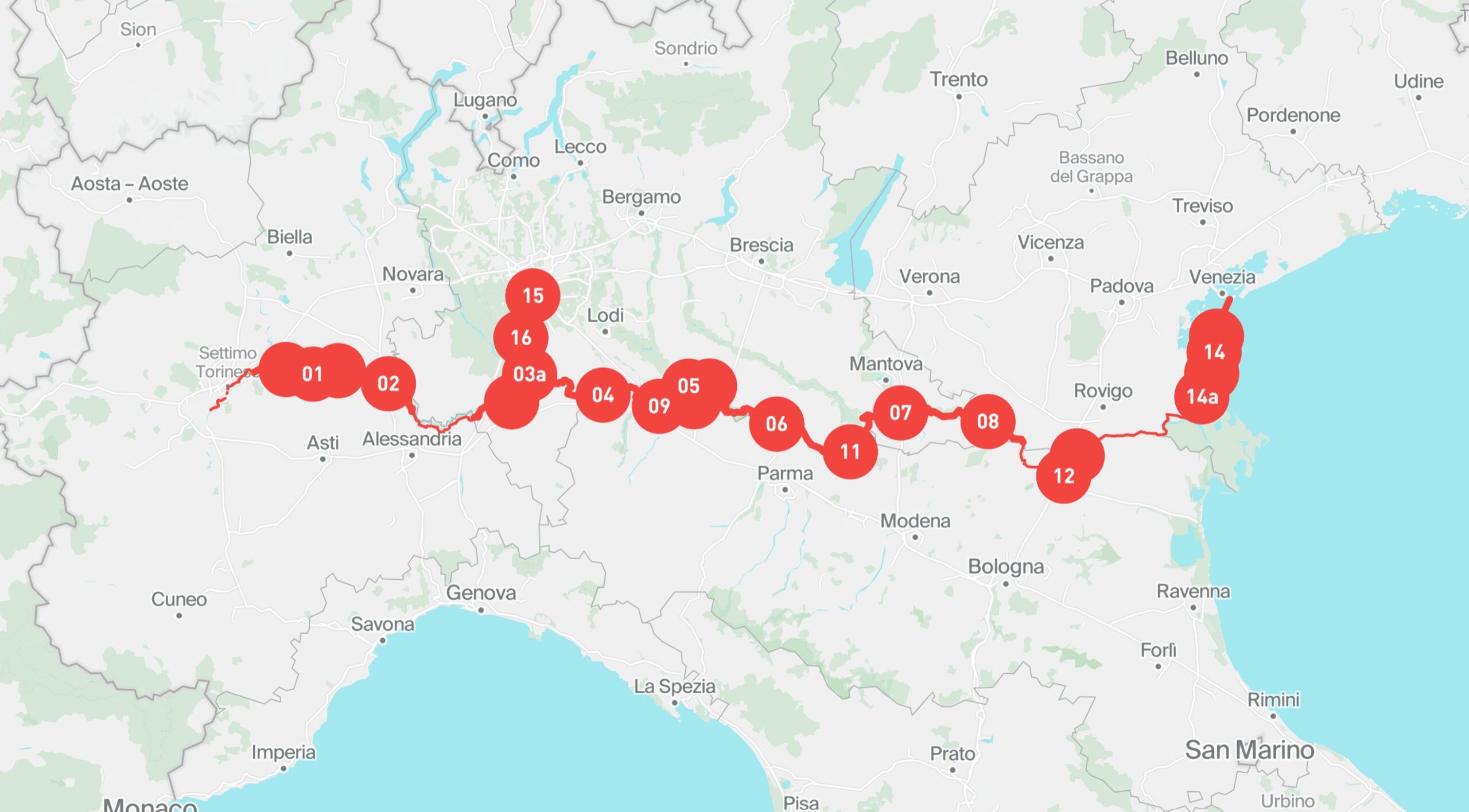 Prima in alto sul fiume, poi appoggiati all’argine maestro: Carmagnola, Gassino, Valenza, Arena Po, San Zenone, e poi Caorso, Zibello, Roccabianca, Colorno, Casalmaggiore, Viadana, Brescello, Boretto, Gualtieri, Guastalla, Ostiglia, Revere, Bondeno, Mesola, Contarina.