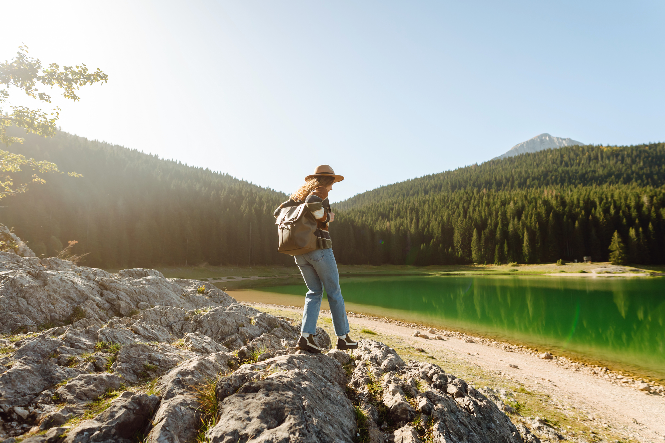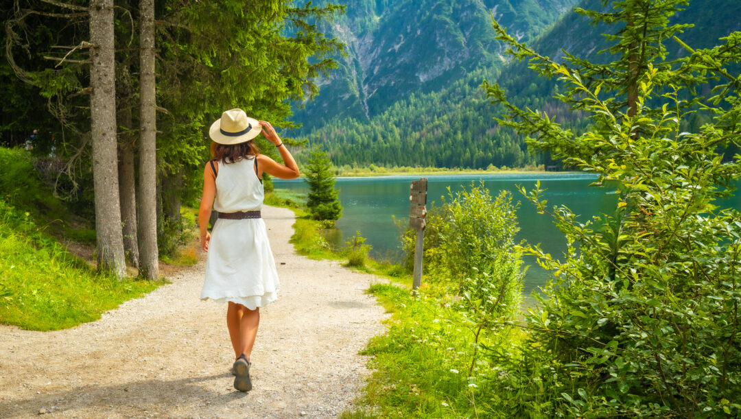 Tourist walking on a path near lake dobbiaco, enjoying the summer landscape in the dolomites