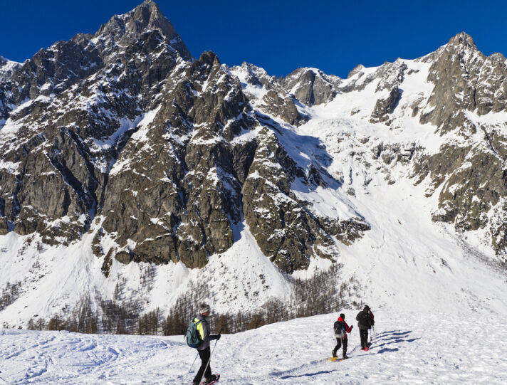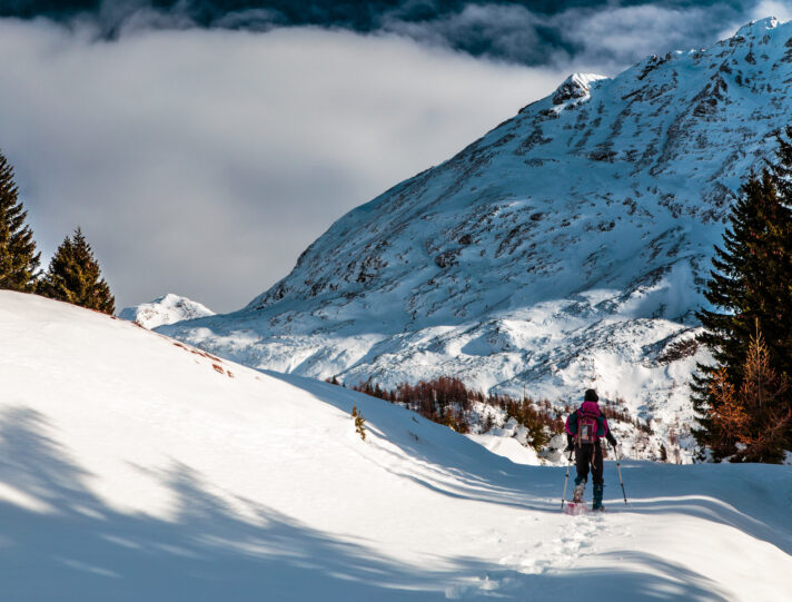 La prima cosa da fare è utilizzare scarponi da trekking invernali, che siano alti, rigidi e fascianti per la caviglia, visto che dovranno supportare anche la struttura e l’attrito derivante dalla camminata con le racchette da neve.