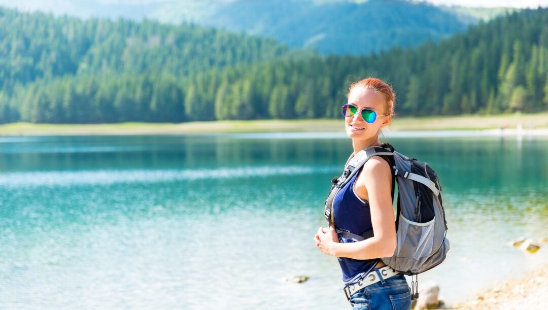Pretty woman with backpack is walking against blue lake