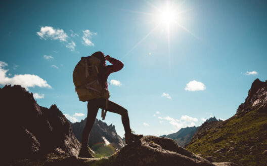 Silhouette of woman with backpack hiking on sunrise mountain top