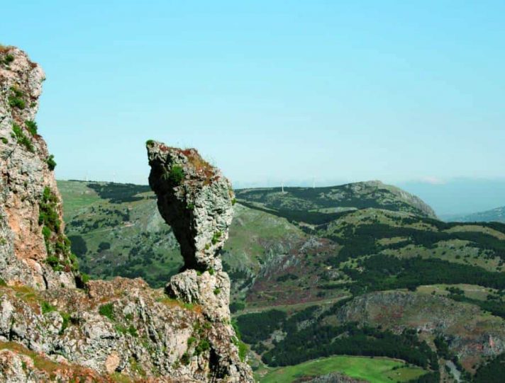 Il percorso inizia dallo spiazzo di fronte all’Eremo di S. Pellegrino, complesso monastico con chiesa e convento, fondato in epoca normanna e ricostruito nel Settecento. Da qui si può salire sul monte Pellegrino (m 940) per visitare l’eremo e la grotta del Drago. Dallo spiazzo si distacca una stradina nella roccia che diventa una scalinata e, attraversando le necropoli del monte delle Nicchie e del monte di Pietà, conduce alla piccola chiesa della Pietà, realizzata all’interno di una spelonca, e alla grande grotta a sei vani che durante le festività ospita il Presepe Vivente. Più avanti il passaggio Malupirtusu, antica via segreta di accesso del re Cocalo alla sua nuova fortezza sulla rupe Gogàla, oggi permette di attraversare da nord a sud la dorsale montuosa del monte Kratas. Il percorso può essere chiuso ad anello percorrendo la panoramica Via San Pellegrino che interseca il fianco nord del gruppo dei monti della Pietà, delle Nicchie e di S. Pellegrino fino al Piano della Madrice (o piazzale di Lauria). Qui domina lo scenario l’edificio della Cattedrale normanna, fra resti di epoca bizantina, altari sacrificali intagliati nella roccia e panorami suggestivi; ad est l’imponente figura del monte Castello (o Pizzo) che svetta dall’alto dei suoi 948 metri, e dove (a circa 450 metri) spiccano i resti del castello normanno della regina Sibilla.