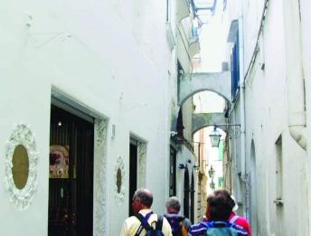 Superati il Municipio, camminando in lieve ascesa attraverso vicoli silenziosi dove le pareti delle abitazioni sembrano quasi toccarsi, poco alla volta si lascia il chiassoso e mondano centro fino ad entrare in un paesaggio dominato dai muretti di recinzione in pietra a secco, passando accanto a giardini dai particolari pergolati fioriti.