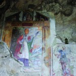 Dalla volta pendono alcune stalattiti mentre sulle pareti laterali si scorgono frammenti sbiaditi di affreschi medioevali. Sulla parete di fondo domina un meraviglioso affresco in buono stato di conservazione risalente al 1601, raffigurante San Simeone vestito da vescovo che con la mano sinistra indica la scritta “ecce iam serenat” (ecco è arrivato il sereno).