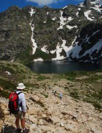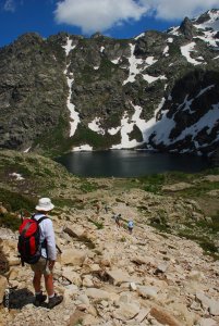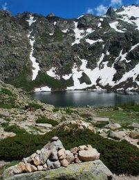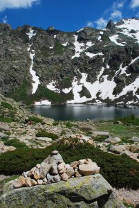 Dopo aver superato il primo gradino scosceso, segue un altro tratto di scala: superato questo tratto attrezzato con catene per facilitare il passaggio, la prima parte dell’ascesa termina presso le rive del lago di Melo (Melu) (1711 m). Si lambisce la riva destra e si va alla capanna di pietra del Parco da dove dirama il sentiero con segnaletica gialla per il vicino invaso di Capitello (Capitellu), 200 metri più in alto. Questo lago di origine glaciale, che nasce dalle acque del Restonica, è circondato da torri rocciose e campi di neve anche in piena estate. Si presenta lo scenario magnifico del Pointe des Spet Lacs e del Capi a i Sorbi. Il sentiero roccioso, in parte anche scabroso, sale rapidamente e supera il rio, per giungere infine sulle rive del Campitello (1930 m).