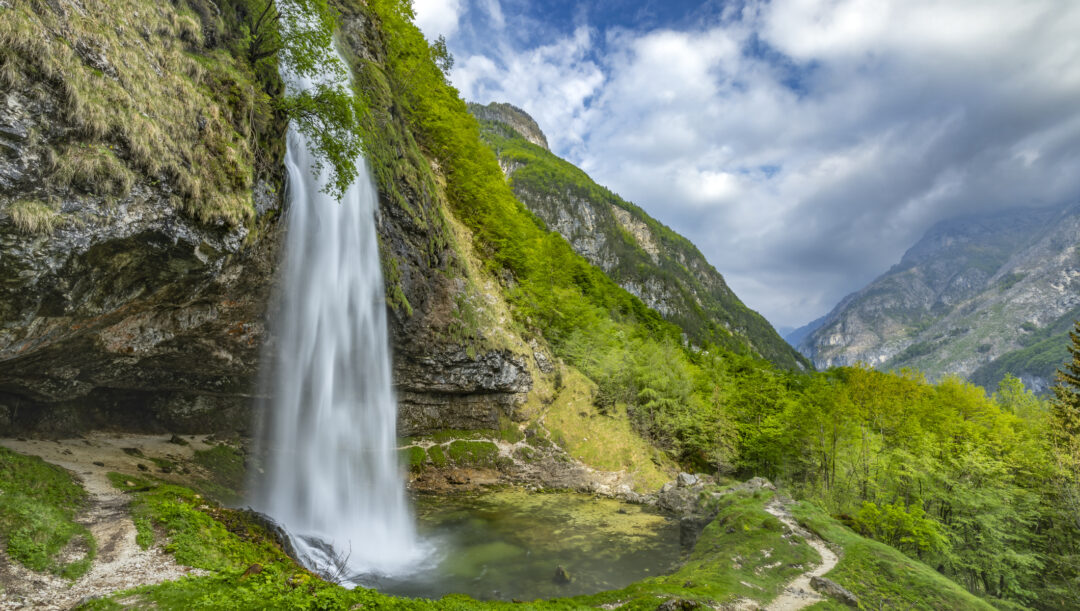 L’acqua sgorga dall’interno della montagna dopo un lungo percorso sotterraneo nel massiccio del Canin, per tuffarsi in una spettacolare caduta di 50–80 m e formare una pozza cristallina incorniciata da faggi: un colpo d’occhio memorabile