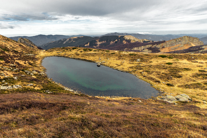 Scenic view of italian mountains landscape with lake, tree, forest and foliage during autumn, Lagastrello pass, Park Appennino tosco emiliano, Carrara, Italy