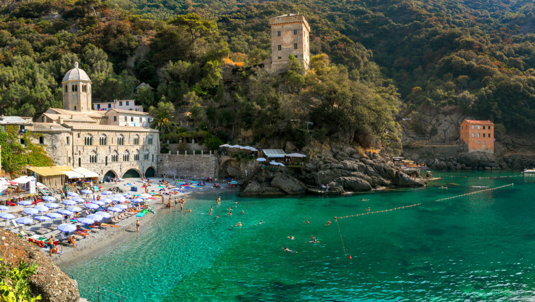San Fruttuoso, Italy - August 29, 2017: Turquoise waters of the natural harbor, people on the pebble beach with umbrellas and historic medieval abbey of San Fruttuoso rises on background on Ligurian Riviera in Italy.