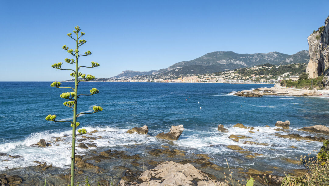 Beautiful agave flower on the Balzi Rossi beach in Ventimiglia with Menton in background