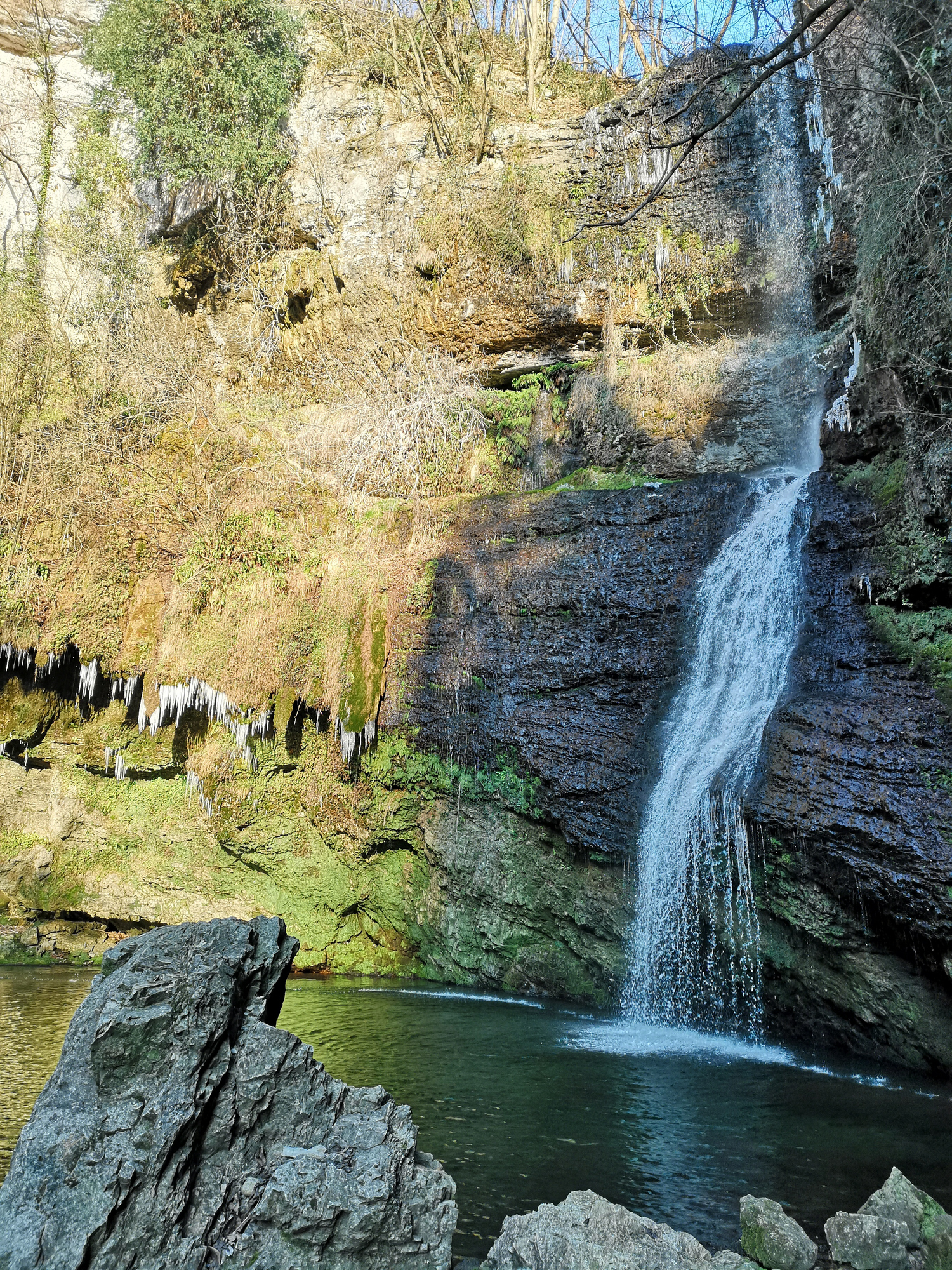 Arrivati al fiume è necessario effettuare un piccolo guado per giungere ai piedi della cascata (nei periodi di forti precipitazioni un paio di stivali può essere utile).