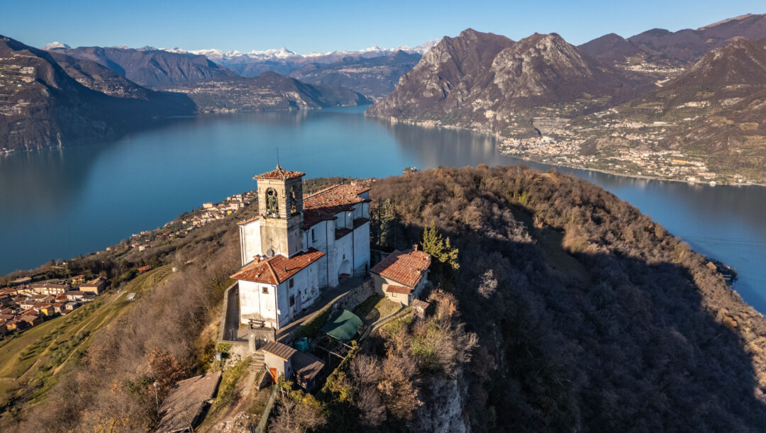 Aerial view of a historic church on a hill overlooking Lake Iseo with mountains in the background under a clear blue sky.