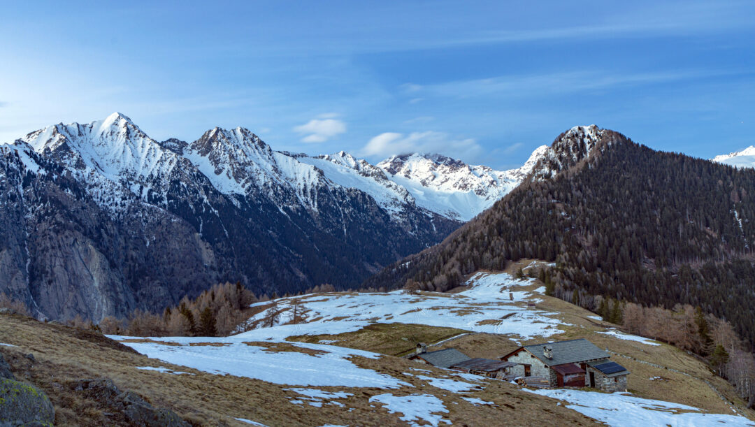L’arrivo all’Alpe Granda offre una vista molto ampia sulla Val Masino e sul profilo della Valle di Mello, che da qui appare come un corridoio naturale incorniciato da pareti granitiche che ne rivelano la struttura verticale.