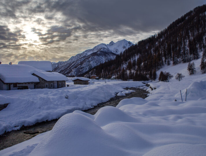 L’inverno veste la valle di una magia silenziosa, con le montagne che si ergono maestose e i boschi avvolti da un manto di neve immacolato.