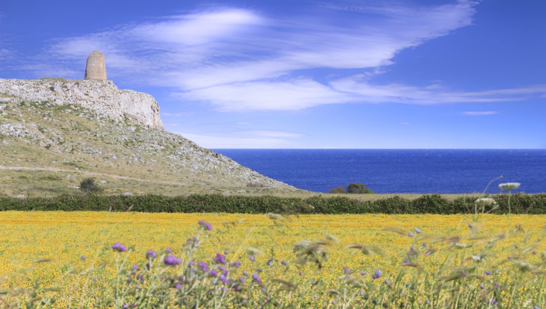 In the background Sant 'Emiliano tower. This medieval ruin is located in The Otranto Santa Maria di Leuca Coast and Tricase Woods Regional Nature Park. Along the Otranto Leuca route, by way of the Tricase wood, an exciting coast-to-coast journey between nature, art and culture.With a coast longer than fifty kilometers and a territory extending over 3,200 hectares, it is the biggest among the regional parks established in the province of Lecce. A road with a thousand hairpin turns is the historic spine of a breathtaking landscape: from the terraced olive groves to the cliffs overlooking the sea it is a natural show to know and to protect, even in its most secret corners. It is not by chance that here, where the last stretch of the Adriatic Sea makes way for the Ionian Sea, a great Protected Area was established with a Regional Law in 2006 and became part of Salento's nature reserves and parks network.