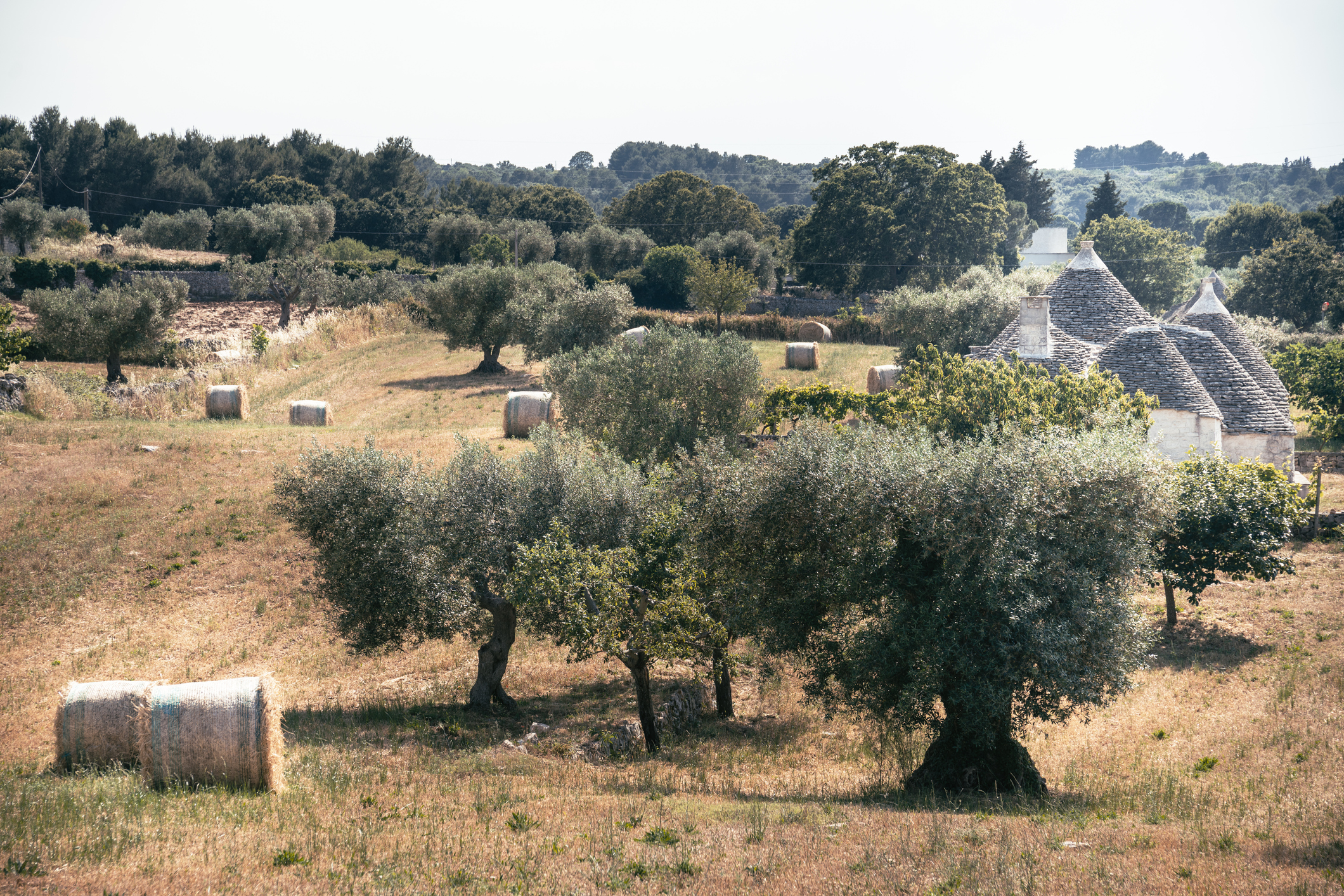 Proseguiamo dritto costeggiando la vallata. Lasciati sulla sinistra vigneti e gruppi di trulli, si arriva a una foggia con una pila in pietra.
