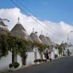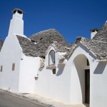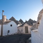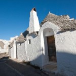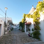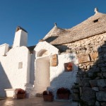 Alla sommità del Rione Monti, uno dei due principali nuclei a trullo di Alberobello, si trova la Chiesa di Sant’Antonio, costruita negli anni Venti del secolo scorso dal sacerdote Antonio Lippolis, grazie alle rimesse degli cittadini, emigrati nelle Americhe. La chiesa è un’opera tipicamente alberobellese, sia per i materiali che per la tecnica costruttiva; presenta, infatti, la peculiarità di essere edificata in forma di trullo, non solo la cupola maggiore, che raggiunge l’altezza di oltre 20 metri, ma anche i due trulli minori e il campanile. Da qui, da Piazza Lippolis, può avere inizio il percorso cittadino; nella vicina Via Isonzo c’è un’area picnic e un parcheggio dove si può lasciare l’auto. Superata Via Monte Pertica, dove ci sono dei bagni pubblici, ci si immerge subito nella magica atmosfera dei trulli, che fanno da corona festosa all’escursionista, già all’imbocco di Piazza D’Annunzio e poi, in discesa, per la gradinata Via Monte San Michele, con numerosi negozietti dove è possibile acquistare prodotti della gastronomia e dell’artigianato locale. Si scende, così, al fondo di quello che doveva essere un antico alveo torrentizio, le cui alte ripe sono costituite dai trulli del Rione Monti, e da quelli della dirimpettaia Aia Piccola. Di qui, da Largo Martellotta, piegando a destra, si raggiunge, all’inizio di Via Indipendenza, un’altra area a parcheggio; attraversato il basolato, di fianco ai bagni si imbocca un vialetto dei giardini pubblici che risale a tornanti fino alla sommità della salita, dove, attraverso uno stretto passaggio, si sbocca in Via Duca degli Abruzzi, prendendo a destra. Si è già nel Rione Aia Piccola, quello forse più caratteristico di Alberobello, che deve il nome a un’aia pubblica, sulla quale si svolgeva la trebbiatura. Lo si attraversa, così, in quello che sembra un allestimento di quinte scenografiche per una rappresentazione fiabesca; i trulli di Aia Piccola, del resto, sono stati scelti più volte come set cinematografico. Quinte non prive di vita, però, anzi. Qui quasi tutti i trulli, uniti a gruppi e affacciati sulle viuzze del rione, sono abitati: lo provano, sia il via vai delle persone che gli odori della cucina – il ragù, soprattutto – che si colgono all’ora di pranzo. Percorsa la strada in tutta la sua lunghezza si imbocca a sinistra in Via Cristoforo Colombo, lungo la quale s’incontra l’azienda Vinicola Masciulli; si torna così indietro fino a incontrare, ancora a sinistra, Via Galileo Galilei e poi a destra Via Verdi, completando in tal modo la conoscenza di questo singolare rione. Giunti in Piazza Mario Pagano ci si trova di fronte al Museo del Territorio, costituito da numerosi trulli comunicanti tra loro, che ospita varie mostre temporanee. Di qui, attraverso Piazza XXVII Maggio e la contigua Piazza del Popolo, si raggiunge Piazza Ferdinando IV, dove c’è Casa D’Amore, dal nome dell’antico proprietario, Francesco, che la eresse all’indomani dell’affrancamento di Alberobello, nel 1797, utilizzando per la prima volta la malta, fino ad allora bandita dalle disposizioni feudatarie. Ritornati in Piazza del Popolo si può raggiungere, in fondo alla vicina Piazza Gian Girolamo e di fianco alla Chiesa di Santa Lucia, già del SS. Sacramento, il Belvedere: una terrazza dalla quale si ha una vista d’assieme della zona monumentale. Tornati indietro, s’imbocca Corso Vittorio Emanuele e lo si percorre per quasi tutta la sua lunghezza. Prima di giungere alla Basilica dei Santi Medici, si prende a destra Via Trento e Trieste e la si segue fino a intersecare, al successivo incrocio, Via Monte Grappa, che si imbocca a sinistra. Ci si trova, ora, in un’altra area a trulli, che si sviluppano sia lungo la strada principale, che nelle vie circostanti. Si superano varie traverse, procedendo in leggera ascesa, fino a incontrare sulla sinistra, dove c’è una fontanella, Via Monte Calvario che si percorre sino al termine, giungendo, finalmente, di fronte alla Basilica dei Santi Medici Cosma e Damiano, in Piazza Curri, dal nome dell’architetto alberobellese, Antonio, che ne progettò il rifacimento in forme neo-classiche nel 1885, sulla precedente chiesa seicentesca. Alla sinistra della facciata della basilica si apre Via del Gesù che conduce in Piazza Sacramento, sulla quale si alza il Trullo Sovrano, a due piani, della seconda metà del Settecento, il più alto e ampio manufatto edificato con questa tecnica costruttiva. Eretto anch’esso da un sacerdote: Cataldo Perta, è aperto al pubblico e ospita attività culturali.