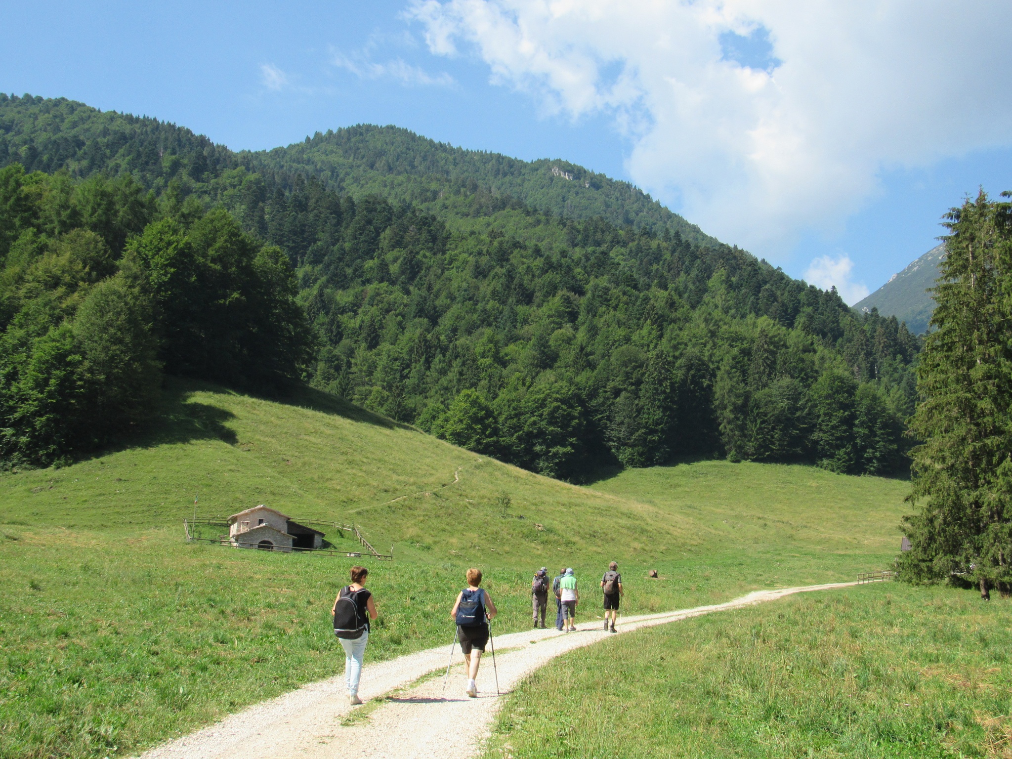 La camminata parte dal Rifugio Monte Baldo e segue un tracciato che costeggia la canaletta cementata usata per incanalare l’acqua dalla sorgente del Corondoler, attraversando una vegetazione fitta e lussureggiante.