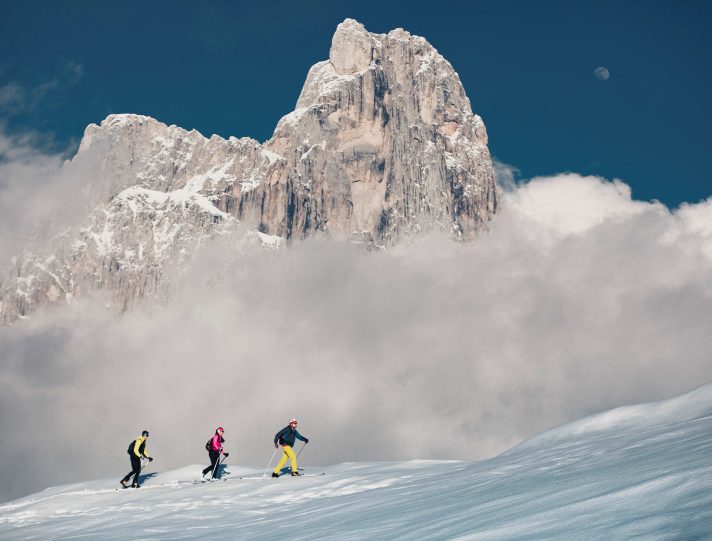 Esplorare Passo Rolle sugli sci offre una vista straordinaria a trecentosessanta gradi sulle Pale di San Martino e sul Lagorai.