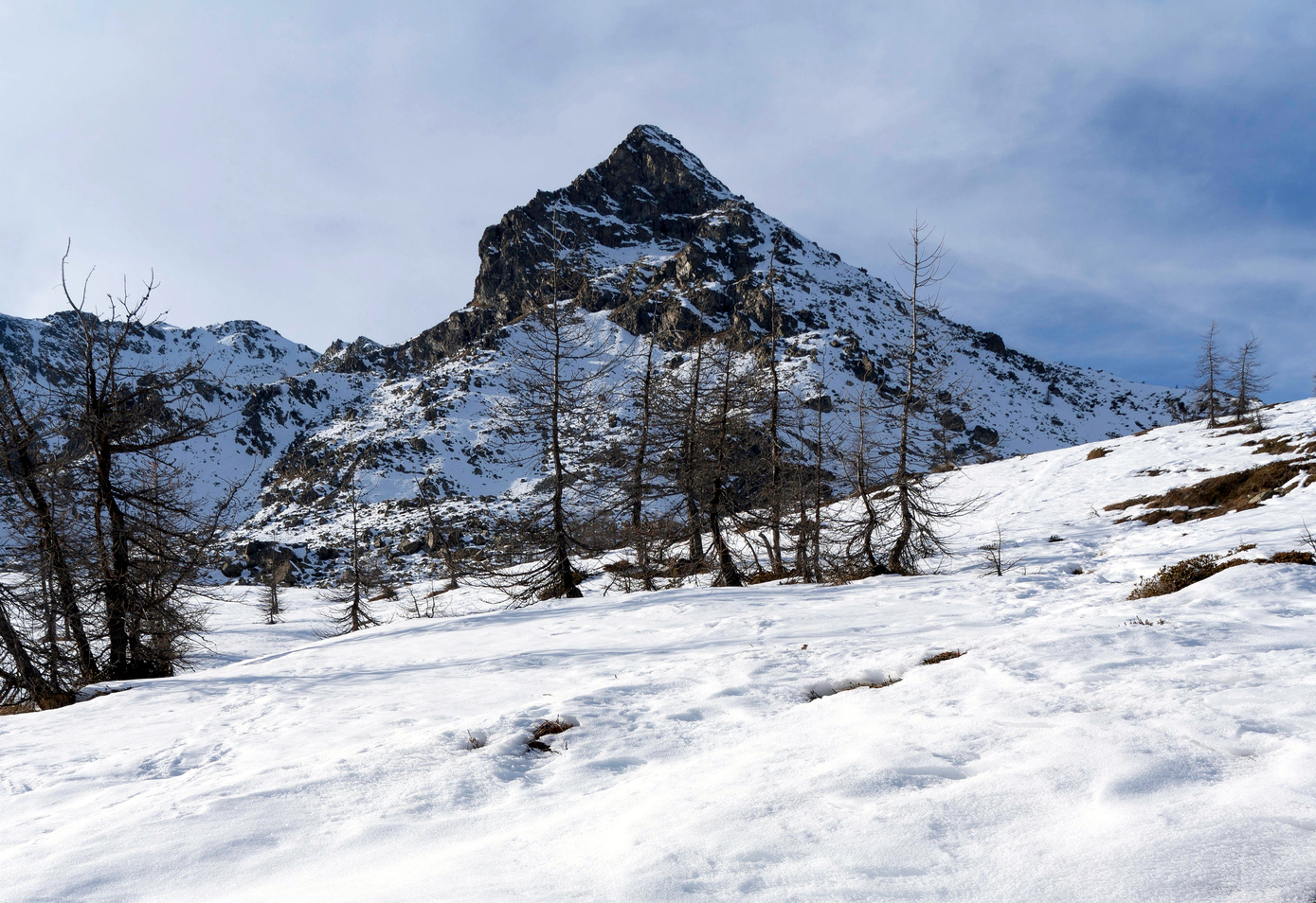 L’ambiente diventa progressivamente più aperto e severo, con il paesaggio che si fa essenziale e la neve che ricopre ogni superficie, creando un senso di continuità e ampiezza tipico dell’alta quota.