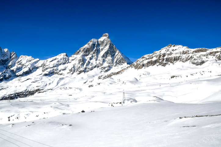 Beautiful snowcapped Matterhorn from ski slopes in Cervinia Valtournenche ski resort, Italian Alps. Snowy mountain peak that borders Italy and Switzerland.
