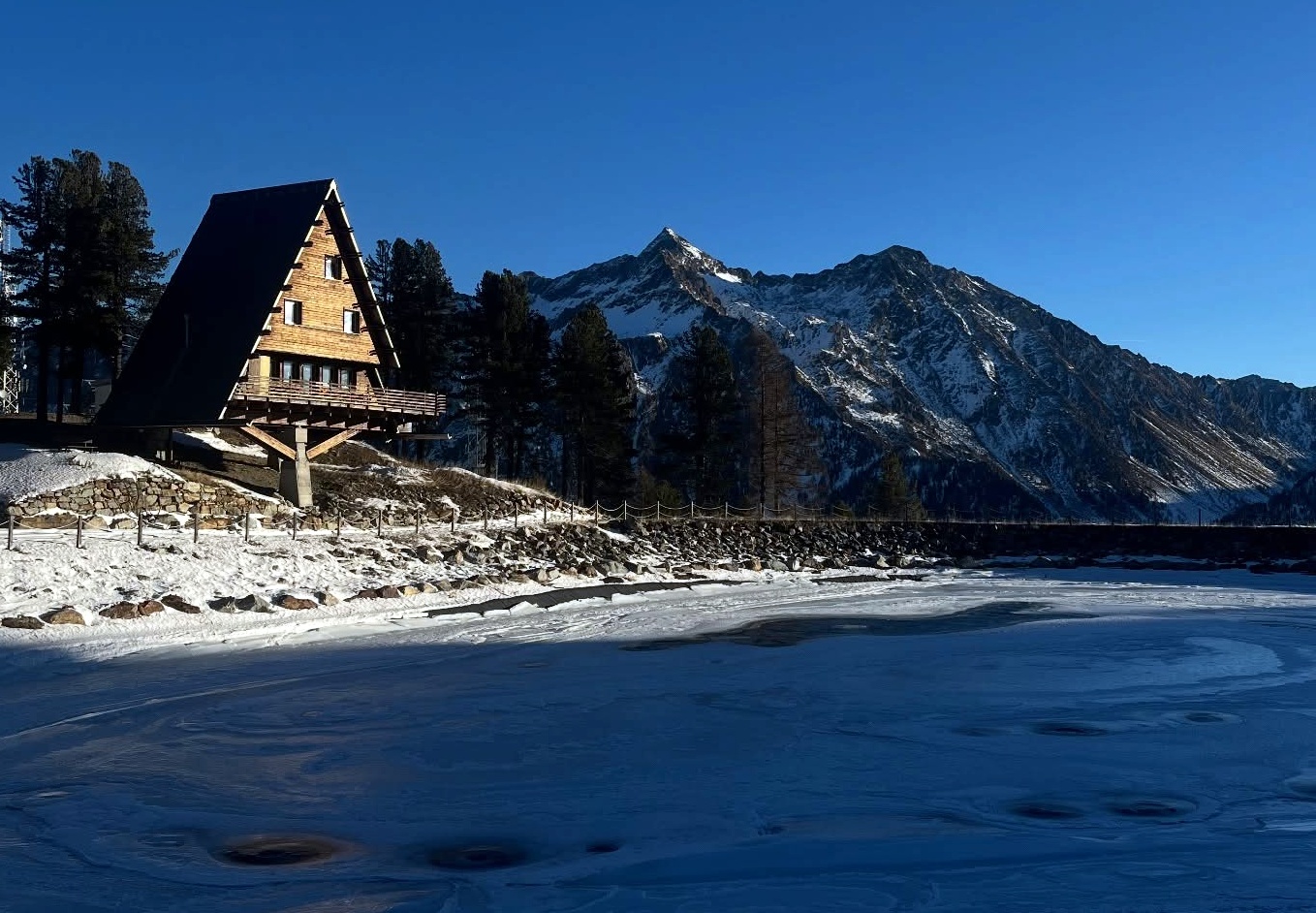 La partenza avviene nei pressi del Lago Gover, bacino artificiale che in inverno si ghiaccia completamente e rappresenta un riferimento chiaro per l’inizio del percorso.