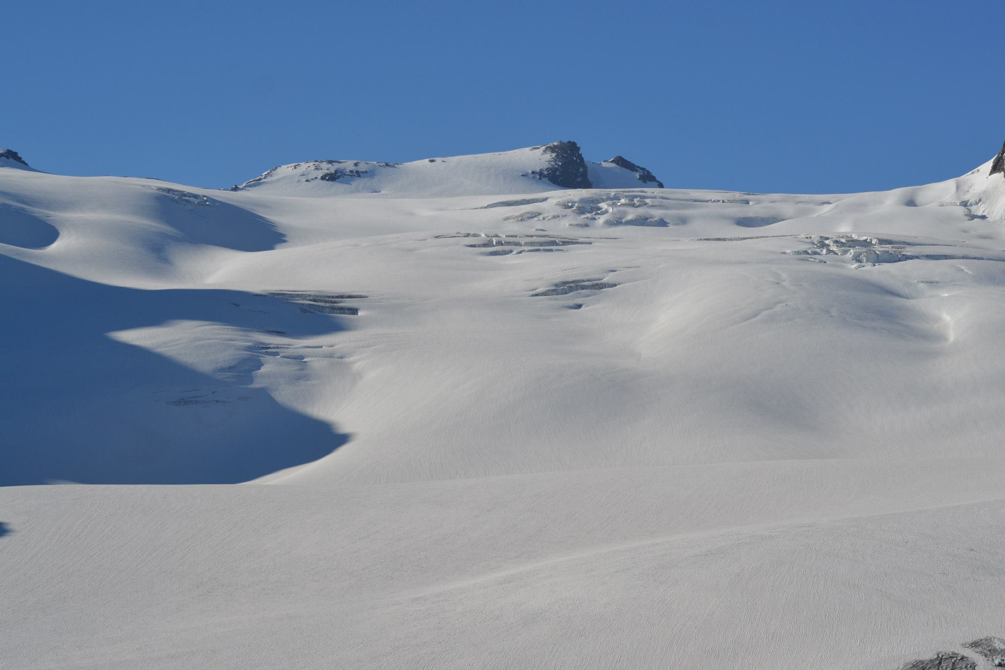 Dopo un tratto pianeggiante nei pressi dell’alpe Glacier, il sentiero inizia a salire più ripidamente fino all’alpeggio del Rutor, dove la neve si fa più compatta e il panorama si apre verso vette e ghiacciai.