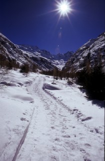 Superato il bivio per il rifugio Chalet del l’Epée, (alla sinistra di chi sale), si continua lungo la strada fino a 2010 metri, circa, dove si abbandona lo sterrato (che si sposta sull’altra riva della Dora) e si prosegue lungo un evidente sentiero.