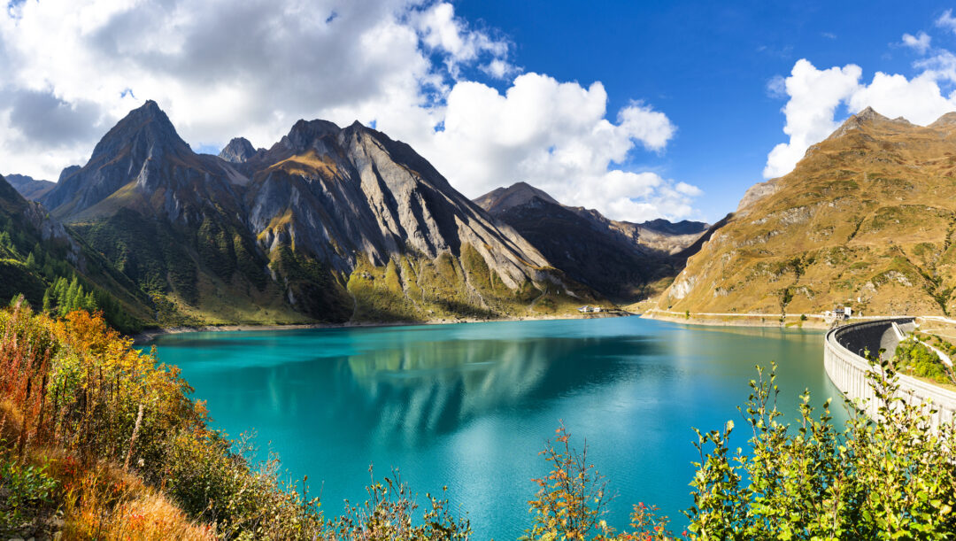 scenic landscape in autumn season from lake of Morasco in high Formazza valley with turquoise water and mountains in background