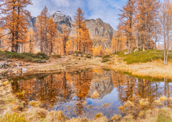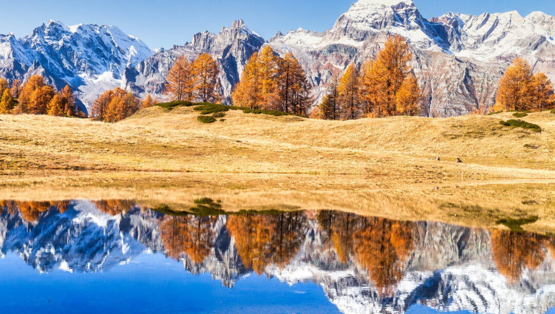 Beautiful landscape with mountain with snowy peaks and golden trees reflected on lake. Sangiatto lake, Alpe Devero, Piedmont region, Italy.