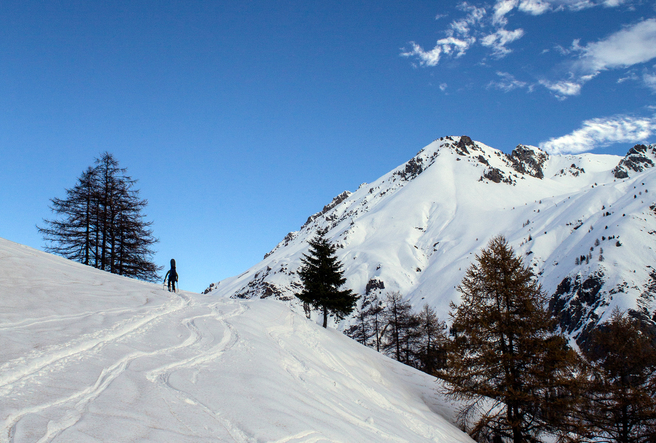 L’esperienza combina ambienti diversi, passando dal bosco alla neve alta dei canaloni e alle creste finali, offrendo un’escursione completa sia dal punto di vista tecnico sia da quello paesaggistico.