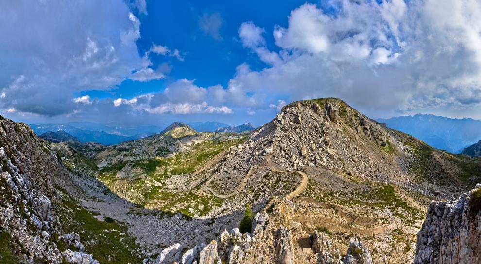 Questo percorso ad anello consente di esplorare le due cime contrapposte più contese durante la Grande Guerra, il Dente Italiano e il Dente Austriaco offrendo, al contempo, panorami eccezionali sulle Prealpi vicentine e Trentine.
