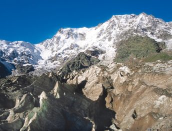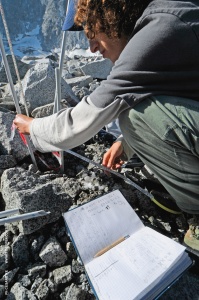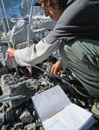 Il geologo Boris Mosconi si muove con disinvoltura sulla morena del ghiacciaio del Veneròcolo, una zona che conosce molto bene e che sta studiando per conto del Dipartimento di Scienze della Terra “Ardito Desio” dell’Università degli Studi di Milano. Lo scopo del progetto è quello di misurare lo spessore del ghiacciaio.