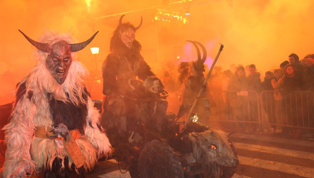 L’immaginario rassicurante dei mercatini e delle luci calde dell’Avvento lascia rapidamente spazio a un’atmosfera ben diversa quando compaiono i Krampus.