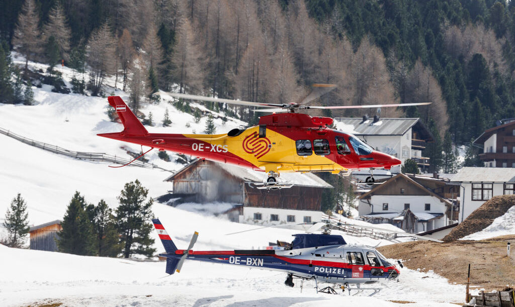 VENT, AUSTRIA - APRIL 11: A helicopter takes of during rescue efforts following an avalanche in the Oetztal valley on April 11, 2024 near Vent, Austria. According to initial reports three Dutch nationals are confirmed dead following the avalanche that occurred below the Martin Busch mountain hut earlier today in mountainous terrain at the end of the valley. (Photo by Jan Hetfleisch/Getty Images)