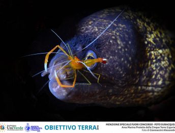 MENZIONE FUORI CONCORSO FOTO SUBACQUEA – Vince Alessandro Giannaccini (Prov. Arezzo) – Area Marina Protetta delle Cinque Terra (Liguria) – OGGETTO FOTO: Gambero meccanico su murena