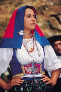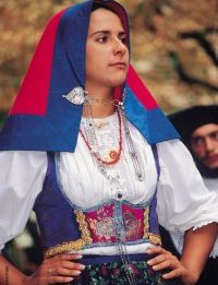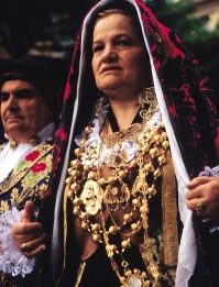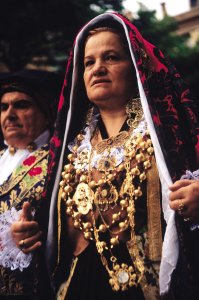 La camicia di lino, o cotone, finemente pieghettata, è sempre ornata da preziosi ricami e gioielli in filigrana. Veramente spettacolari sono le spille, gli orecchini, le collane d’oro, d’argento e di corallo, i rosari di pietre dure che adornano questi variopinti tessuti. Alla gonna lunga fino alle caviglie, normalmente scura, si accompagna il grembiule ornato da preziosi ricami anche a fili d’oro e d’argento. E infine, il particolare fazzolettino portato sul capo che rivela alla gente la provenienza di chi lo indossa, l’ estrazione e lo stato sociale.