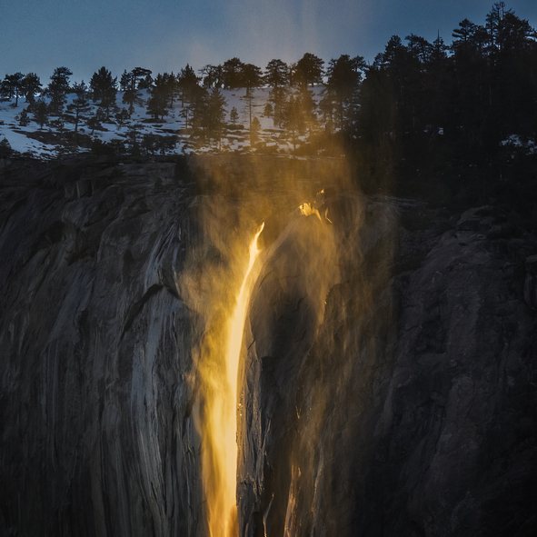 C’è un momento dell’anno in cui l’acqua sembra prendere fuoco. Succede a febbraio, nello Yosemite National Park in California, quando i raggi del tramonto colpiscono una sottile cascata che scorre lungo la parete orientale di El Capitan.