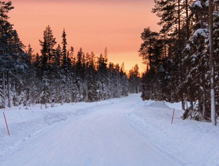 La temperatura oscilla tra -20° e -30°. Le piante coperte di neve, i larici sagomati e piegati dall’inverno lappone, sono gli unici protagonisti dello scenario che costeggia la pista verso Kolari.