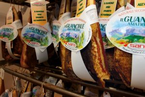 Parlando di salumi, non si può dimenticare il prosciutto amatriciano I.G.P., un crudo di qualità elevata, compatto e dagli aromi intensi, frutto di circa 14 mesi di stagionatura. A produrre l’Amatriciano I.G.P. è il salumificio Sano, azienda d’eccellenza che ha saputo raccogliere tutta l’esperienza dei maestri norcini. E poi c’è lui, il vero principe dei salumi locali, il più venduto e utilizzato: il guanciale amatriciano DE.CO., ricavato esclusivamente dalla gola del suino, tagliato nella tipica forma triangolare, salato, speziato e lasciato a stagionare per almeno 30 giorni. Oltre ad essere ingrediente base dell’amatriciana, è il prodotto che meglio rappresenta la tradizione pastorale del luogo: la sua facilità di conservazione e l’elevato apporto energetico lo rendevano alimento ideale per i lunghi periodi di permanenza sui Monti della Laga o durante la transumanza.