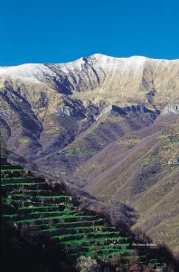 Le colline mostrano le fasce coltivate ad olivo fino a quote impensabili, i verdi pascoli, i boschi di castagno, il tortuoso percorso dei torrenti, completano questo quadro coloratissimo. Il paesaggio, qui, è il risultato di un’evoluzione morfologica ad opera della natura, ma anche del duro e tenace lavoro dell’uomo che ha piegato alle proprie esigenze, nel corso dei secoli, un territorio selvaggio e ostile.