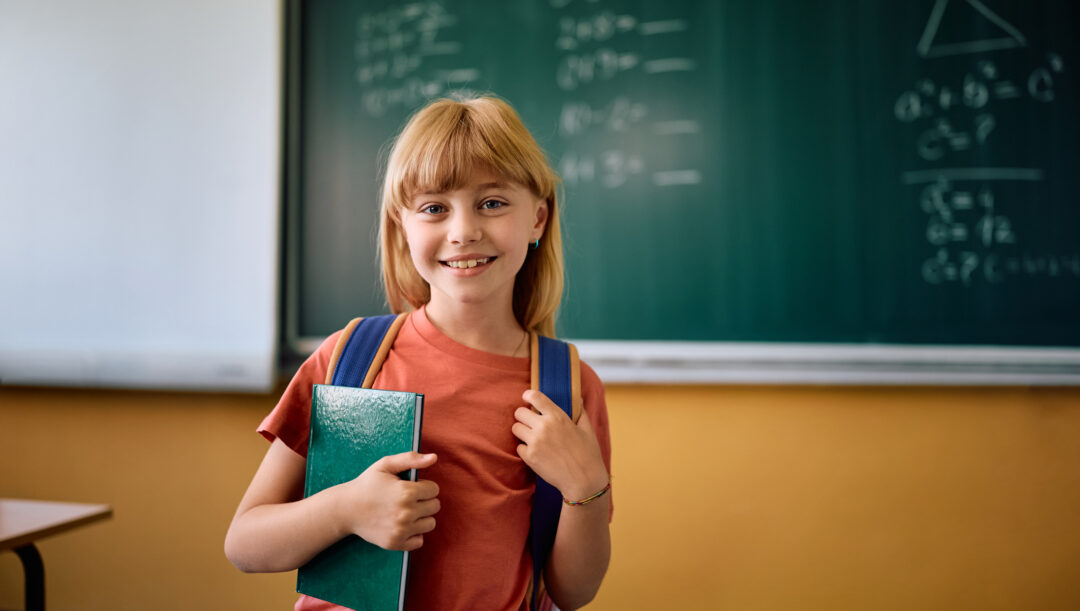 Happy elementary school student standing in the classroom and looking at camera. Copy space.