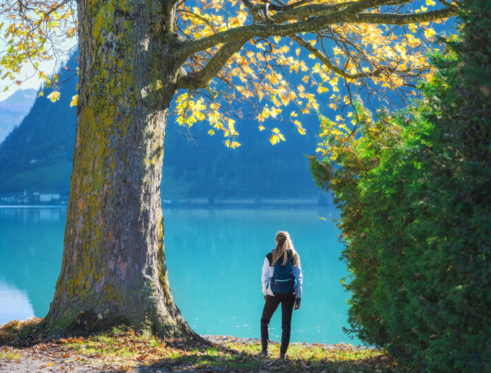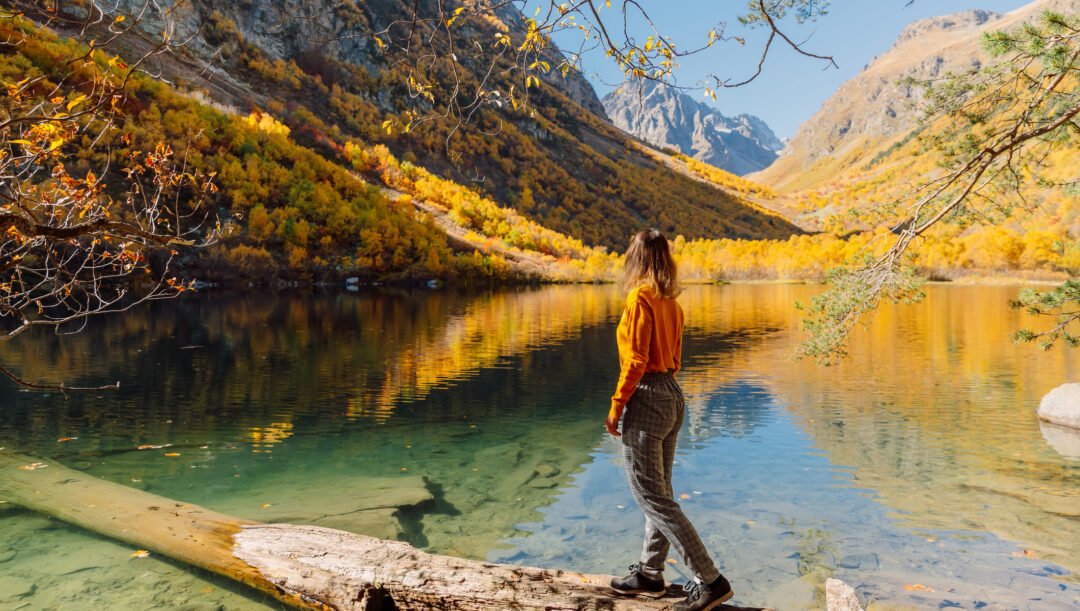 Woman at crystal lake in the autumnal mountains. Mountain lake and traveller woman
