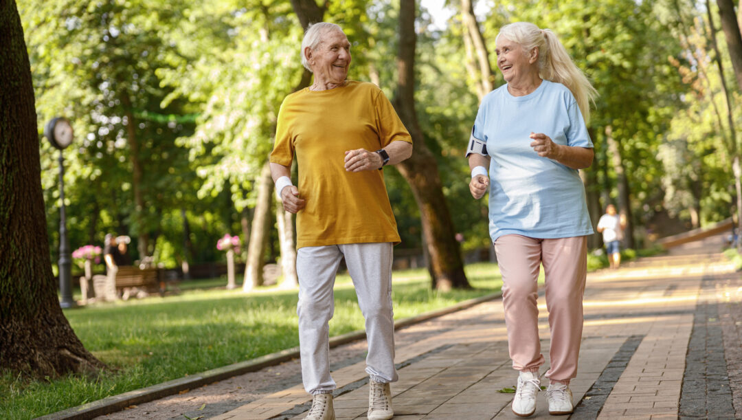 Positive senior family couple run together along road in green park on summer day. Active lifestyle and healthcare