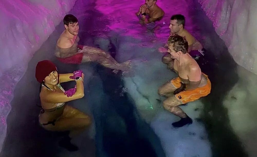 La particolarità sta nel contesto: non una semplice vasca o un lago alpino all’aperto, ma un ambiente chiuso e scolpito nel ghiaccio, a circa 30 metri di profondità sotto la superficie del ghiacciaio.