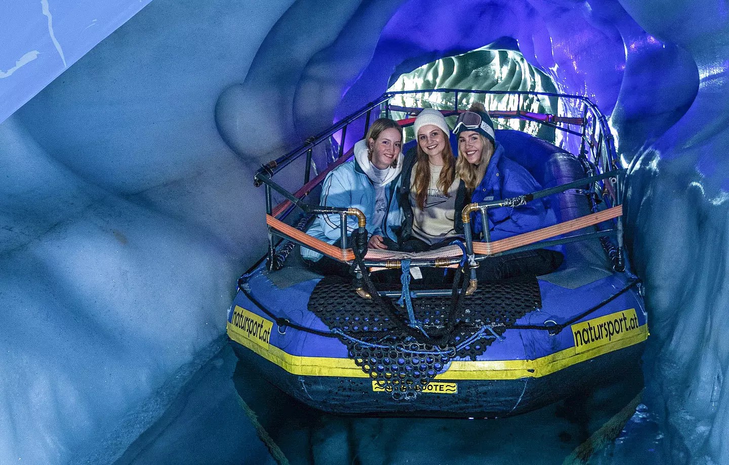 In alcune cavità scorre un fiume sotterraneo e il tragitto, lento e controllato, permette di attraversare il ghiaccio da una prospettiva completamente diversa: non più a piedi, ma sull’acqua, con pareti trasparenti che riflettono la luce in modo particolare.
