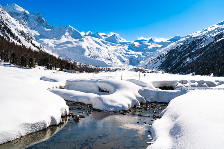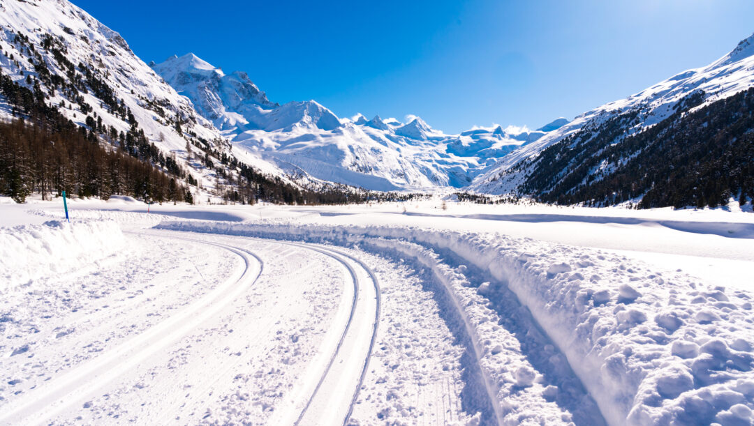 Val Roseg, in Engadine, Switzerland, in winter, with snow-covered cross-country ski slopes.