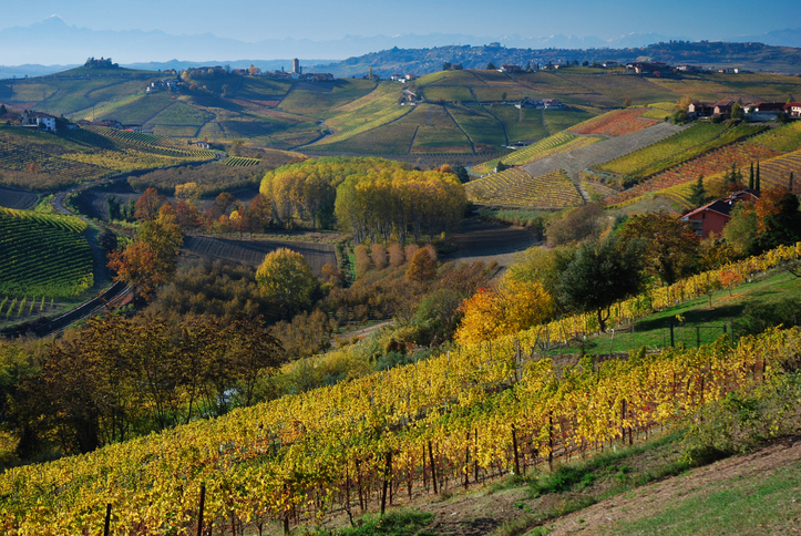 Colorful autumnal vineyards and snowy mountains on background in Piedmont, Northern Italy.