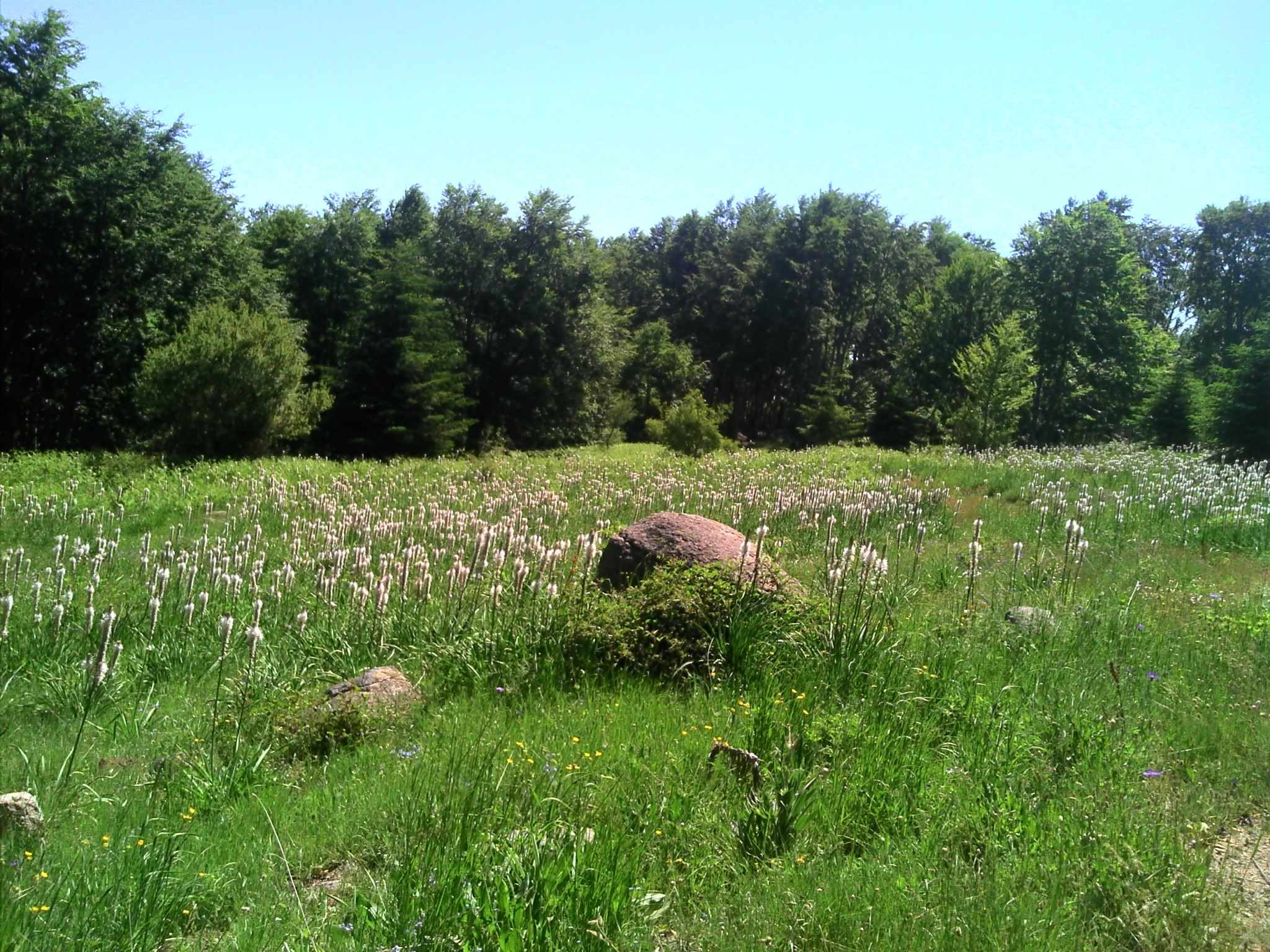 La strada provinciale 211 ci porta tra boschi di pini larici e prati, fino a un pianoro assolato disseminato di grandi pietre levigate e arrotondate.